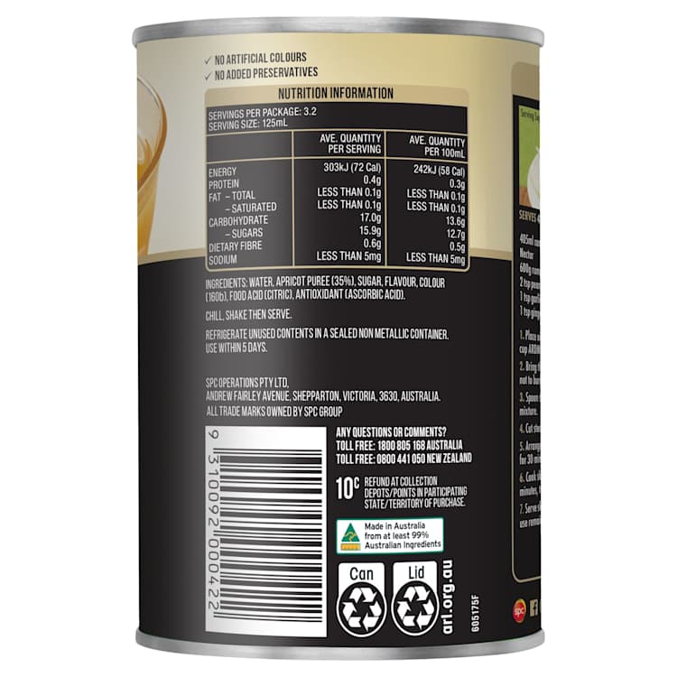 Ardmona Apricot Nectar Fruit Drink contain no artificial colours and no added preservatives.