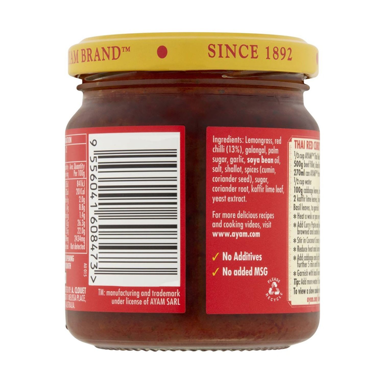 Lemongrass, Red Chilli (13%), Galangal, Palm Sugar, Garlic, Soybean Oil, Salt, Shallot, Spices (Cumin, Coriander Seed), Sugar, Water, Coriander Root, Kaffir Lime Leaf, Yeast Extract
