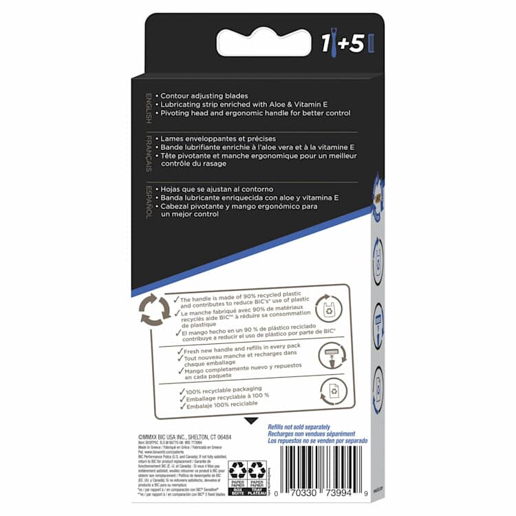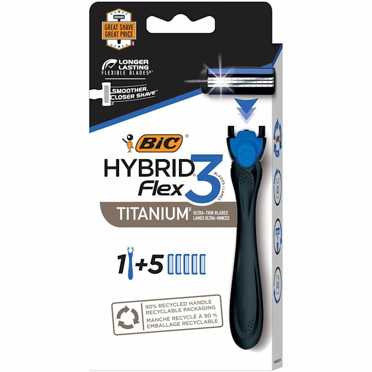 Experience a close, comfortable shave with the BIC Flex 3 Hybrid Men’s Disposable Razors. Bring home a dependable 6-piece razor kit for men that contains one handle and five cartridges. Featuring three long-lasting, ultra-thin titanium blades, the BIC Flex 3 Refillable Disposable Shaving Razors for Men deliver a close, efficient shave. Each cartridge has a lubricating strip enriched with aloe and vitamin E for enhanced glide. To provide more control while shaving, the BIC Flex 3 mens razors for shaving have a 30-degree pivoting head that moves with the contours of your skin and an ergonomic handle. Plus, you can make an impact with your shave because the razor handle is made of 90% recycled plastic, and the packaging is 100% recyclable. The BIC Flex 3 Hybrid Men's Disposable Razors are great shavers for face, head and body use. As an added bonus, the slim design easily fits into toiletry kits, so you’re ready for quick grooming wherever, whenever you need it. When you’ve used all of the razors, simply purchase a new pack. Get a comfortable, yet affordable shave when you choose BIC Flex 3 Hybrid Disposable Razors.