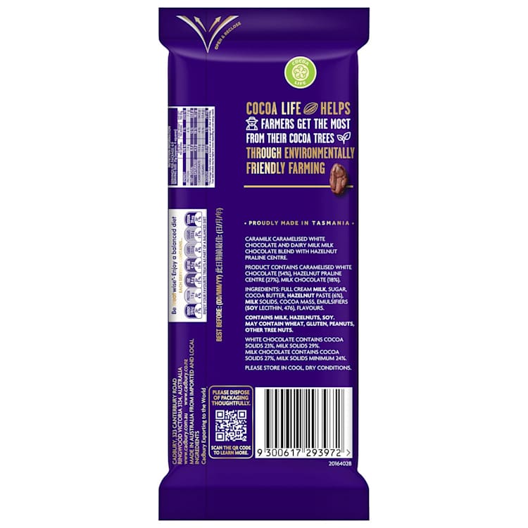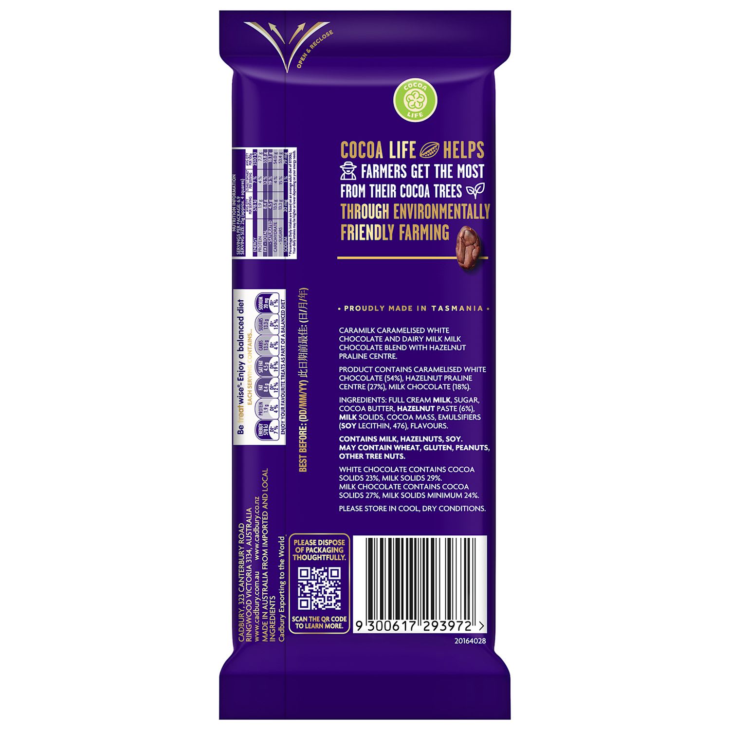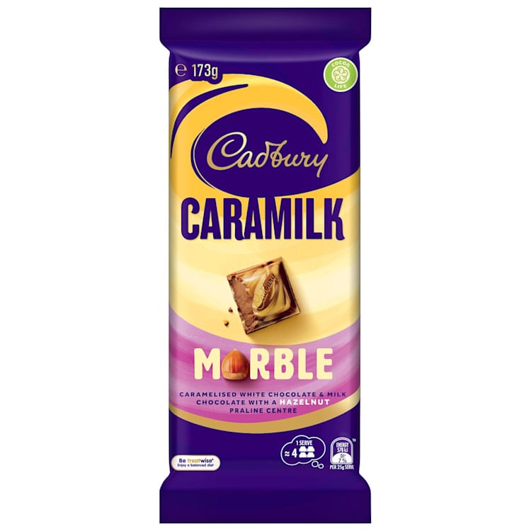 Cadbury Caramilk Marble is caramelised white chocolate & milk chocolate with a hazelnut praline centre.