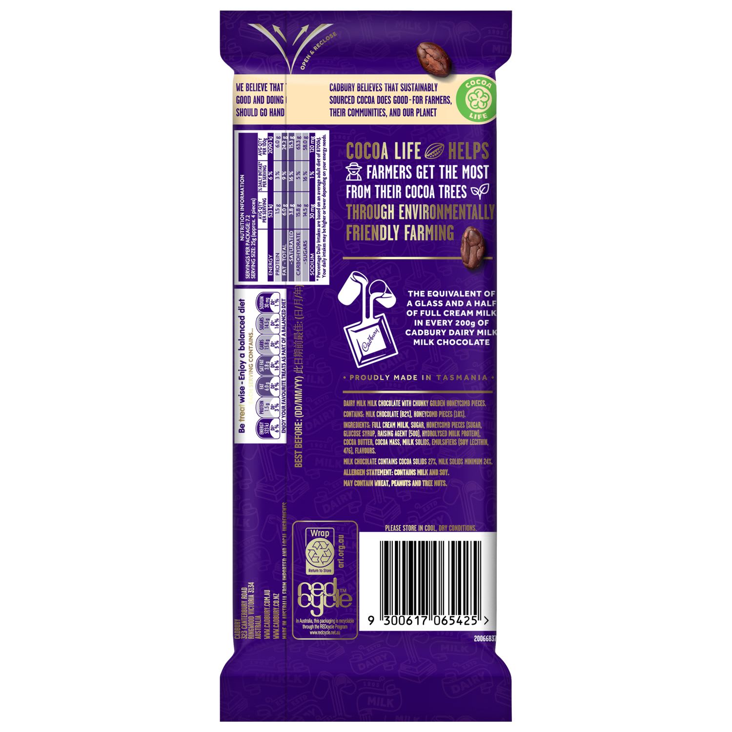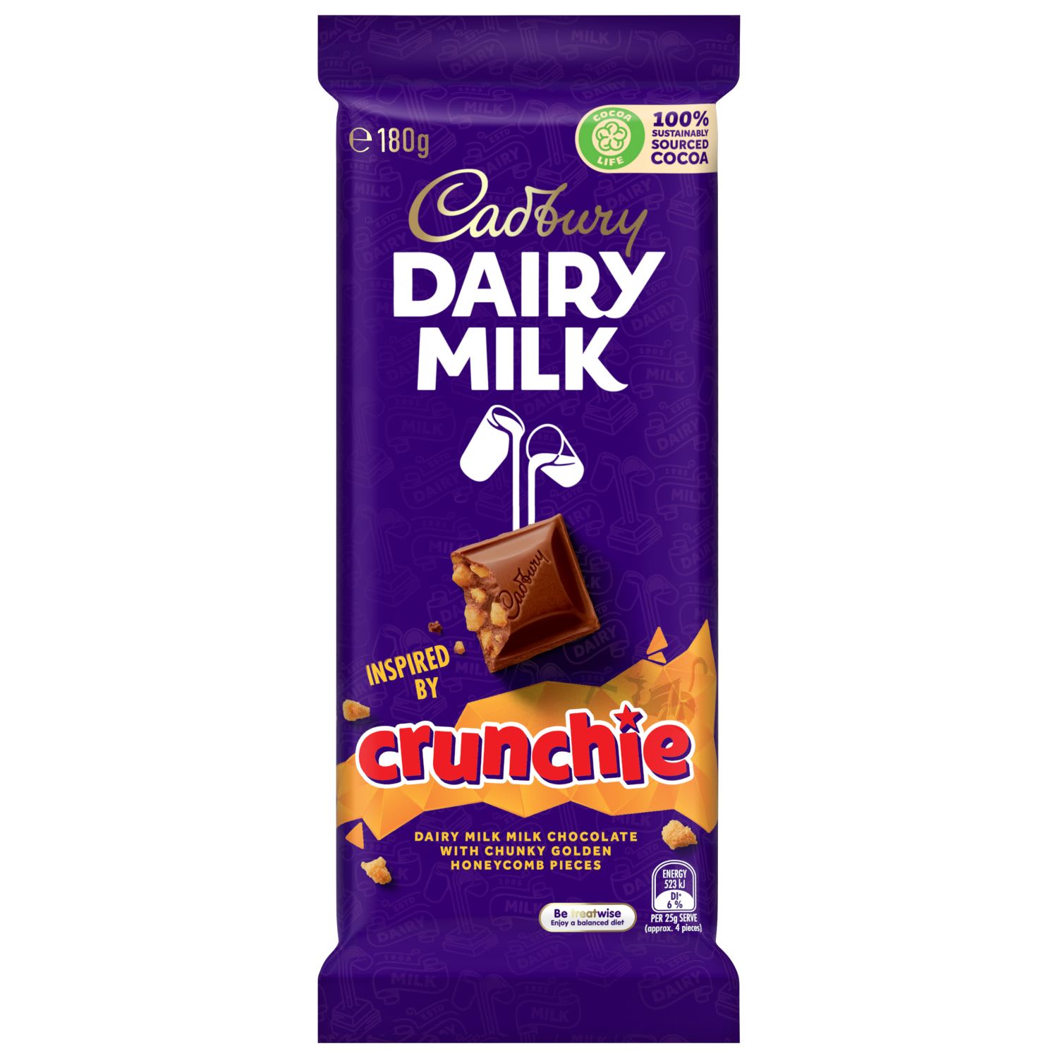 Cadbury Dairy Milk Crunchie contains Dairy Milk milk chocolate with chunky golden honeycomb pieces. The equivalent of a glass and a half of full cream milk in every 200g of Cadbury Dairy Milk Milk Chocolate.