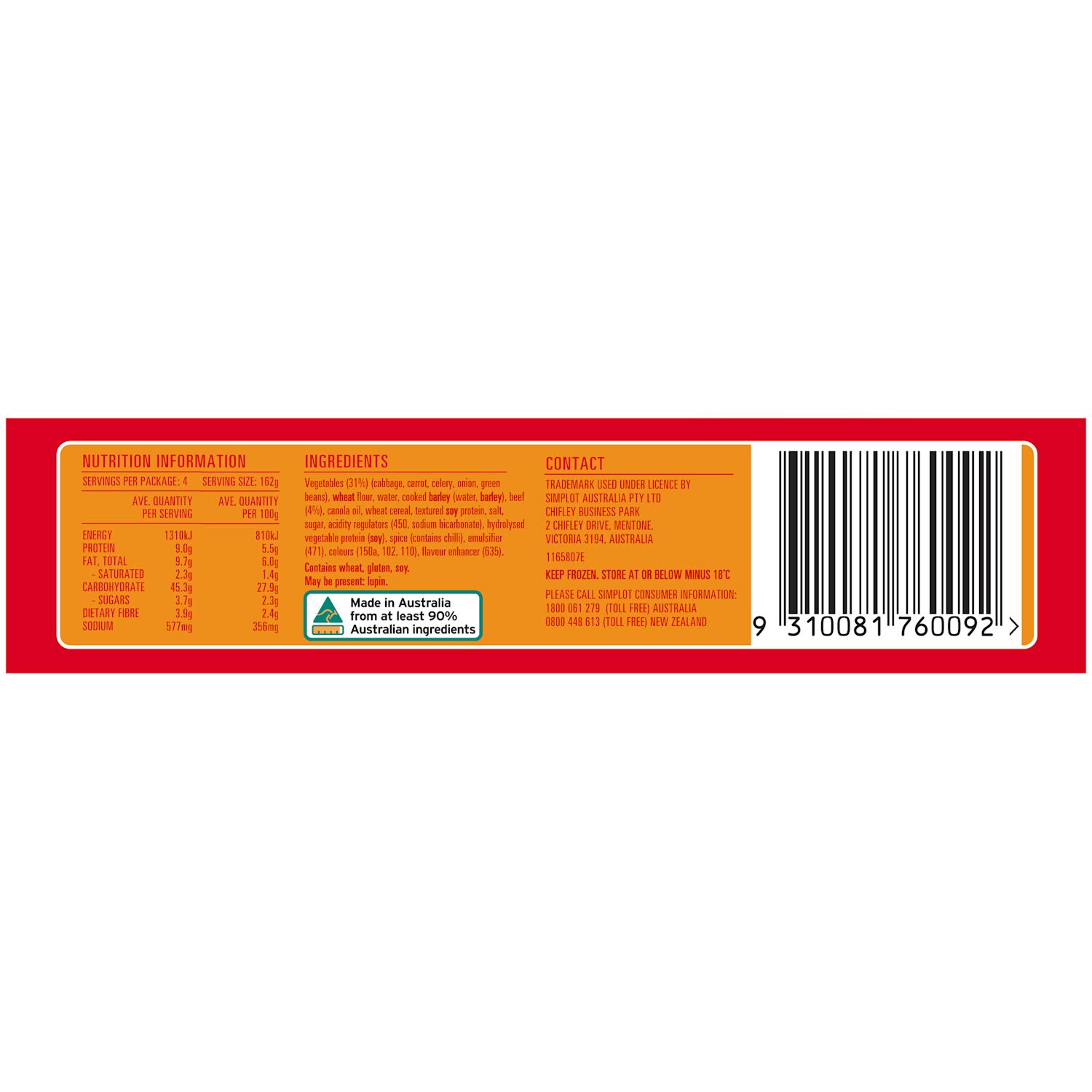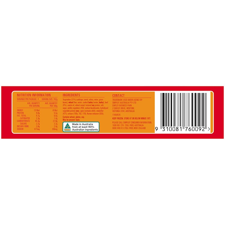 Wheat Flour, Cabbage (18%). Water. Cooked Barley (Water, Barley), Carrot, Beef (4.5%), Animal Fat, Wheat Cereal, Celery, Onion, Green Beans, Textured Soy Protein, Salt, Sugar, Acidity Regulators (450, Sodium Bicarbonate), Hydrolysed Vegetable Protein (Contains Soy), Spices (Contains Chilli), Emulsifier (471), Colours (102, 110), Flavour Enhancer (635).