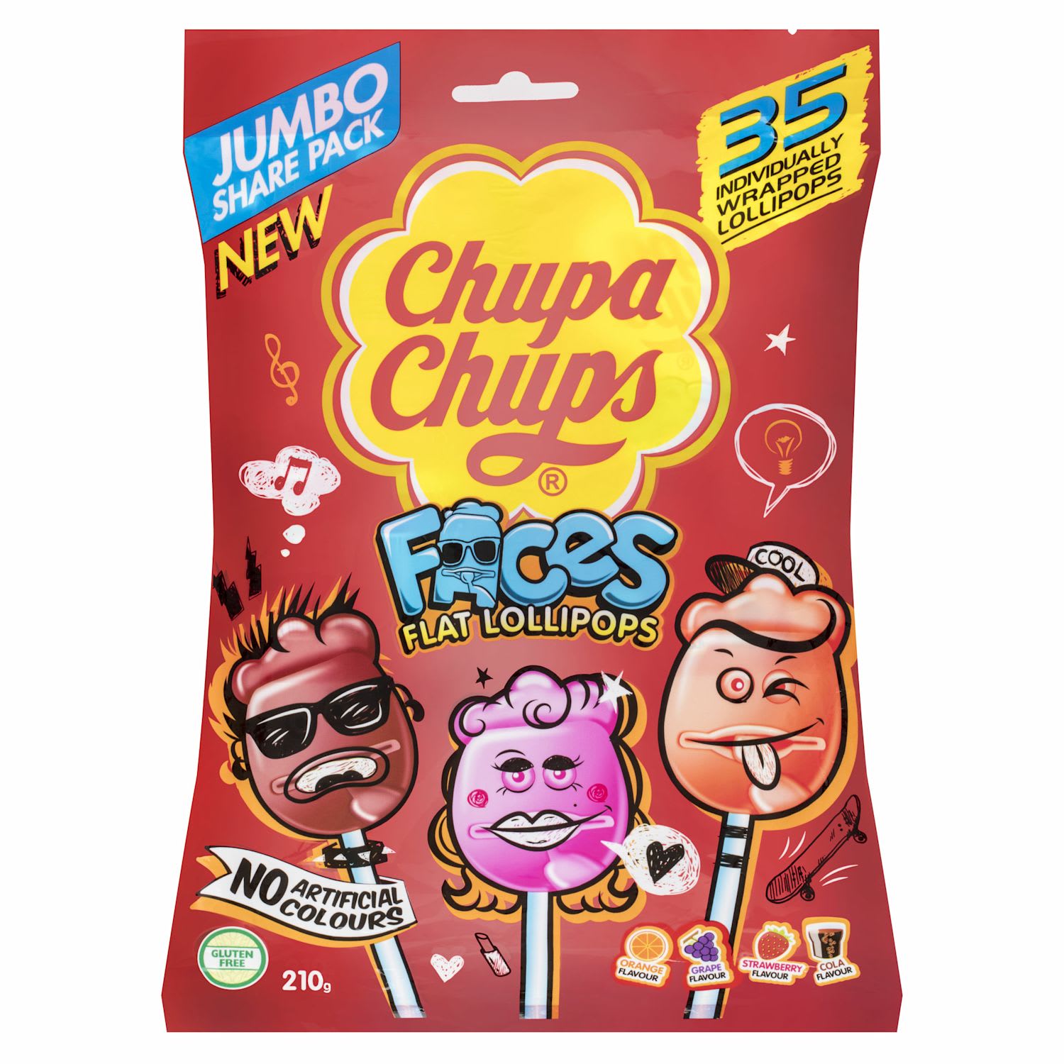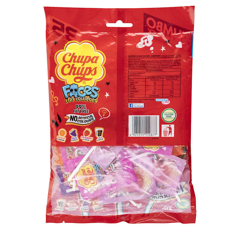 Chupa Chups forever fun brings fun nre lollipop- Faces Flat Lollipops contain no artificial colours, 99% fat free and Gluten free! Each lollipop wi made with fun characters and are individulaly packed. great for individual consumption and sharing with friends.