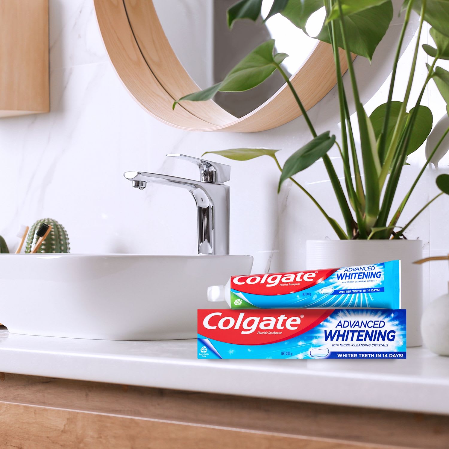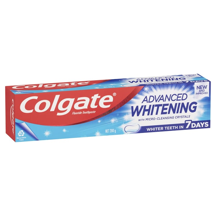 Colgate Advanced Whitening Toothpaste is a teeth whitening paste with active Micro-Cleansing Crystals, clinically proven to gently polish and effectively whiten your teeth.