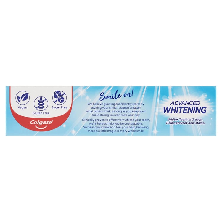 Colgate Advanced Whitening Toothpaste is sugar free, gluten free and vegan. Made in a recyclable tube (does not include cap).