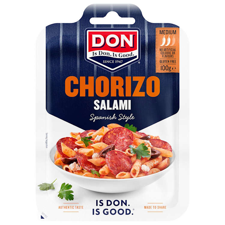 DON® Sliced Chorizo Salami is a Medium hot Spanish style salami, gluten free and made with no artificial colours or flavours. Mix with cooked pasta, tomatoes, onions and red capsicum for an easy dinner option.