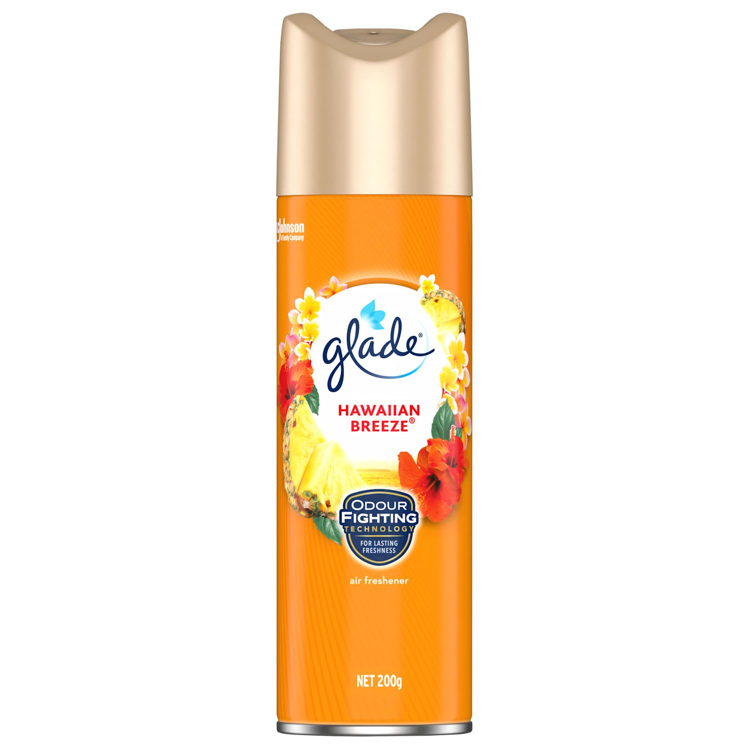 Glade Hawaiian Breeze Air Freshener Spray. Crafted with bright notes of tropical fruits, pineapple, and frangipani, this fragrance is masterfully designed for an instant holiday.