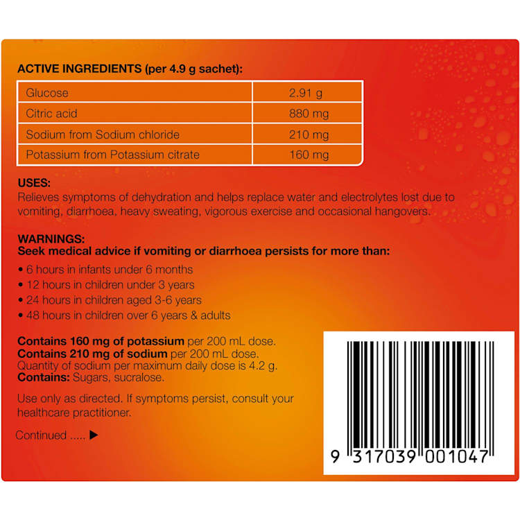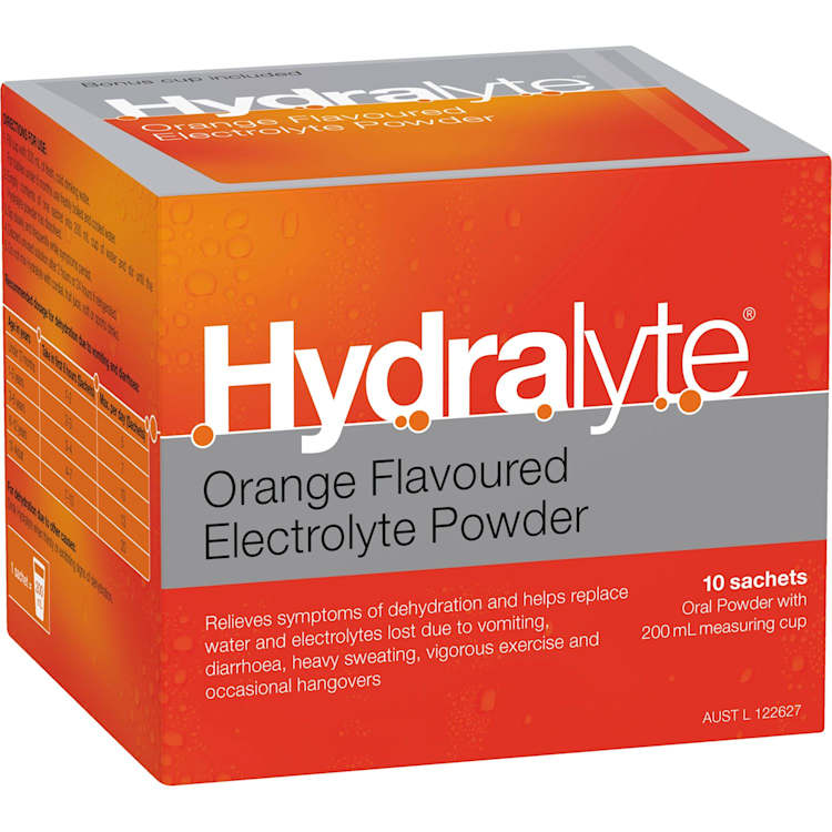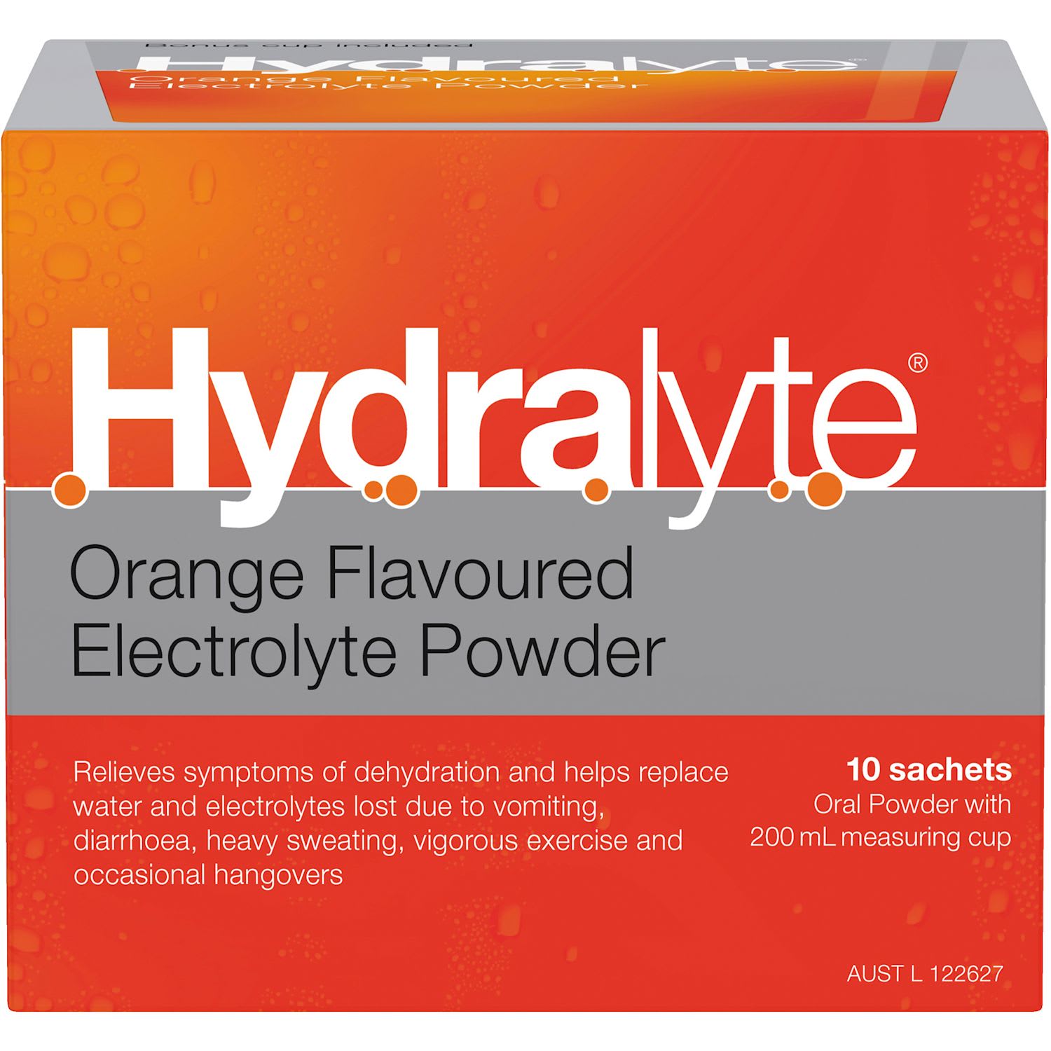 Hydralyte Electrolyte Powder Orange Flavoured relieves symptoms of dehydration and helps replace water and electrolytes lost due to vomiting, diarrhoea, heavy sweating, vigorous exercise and occasional hangovers.