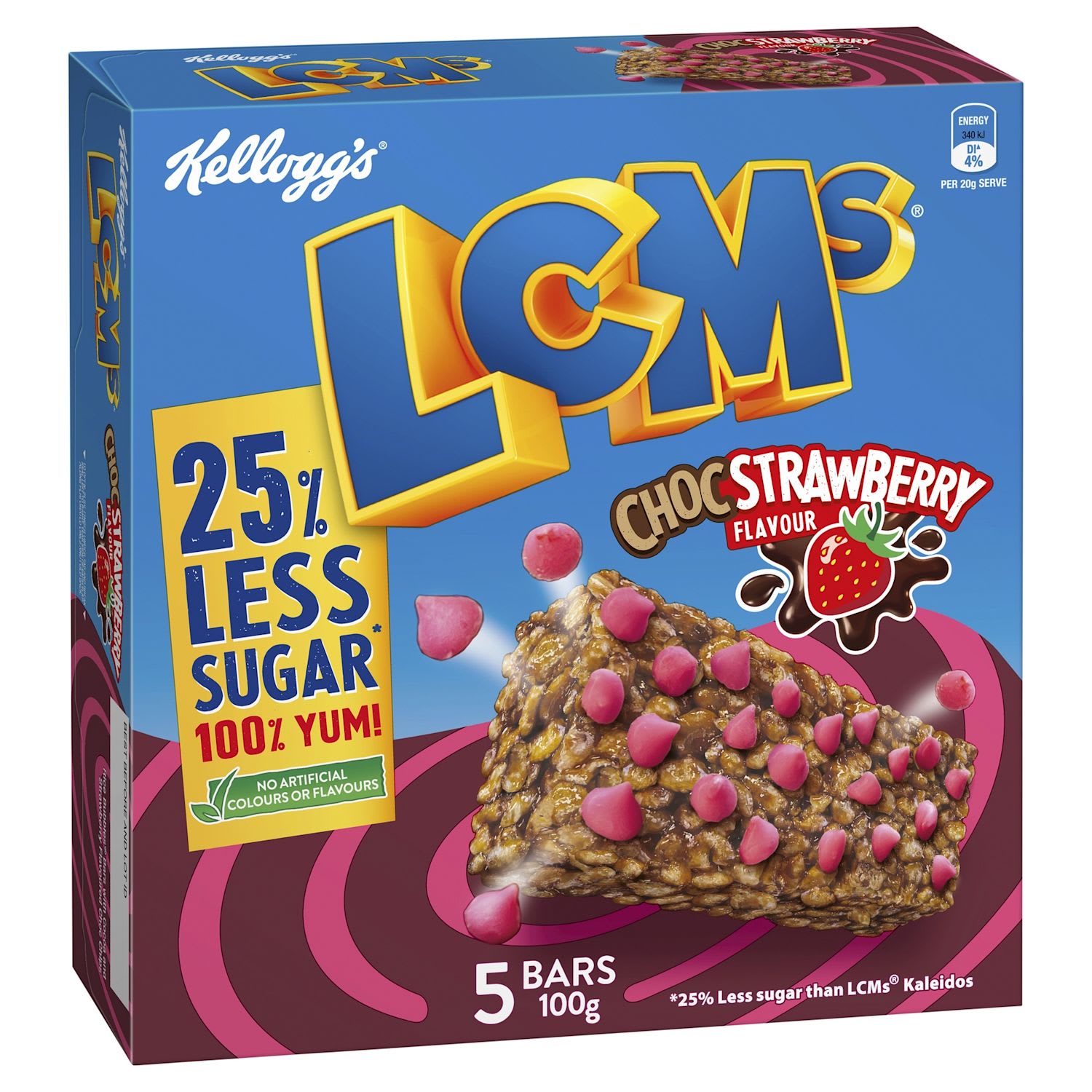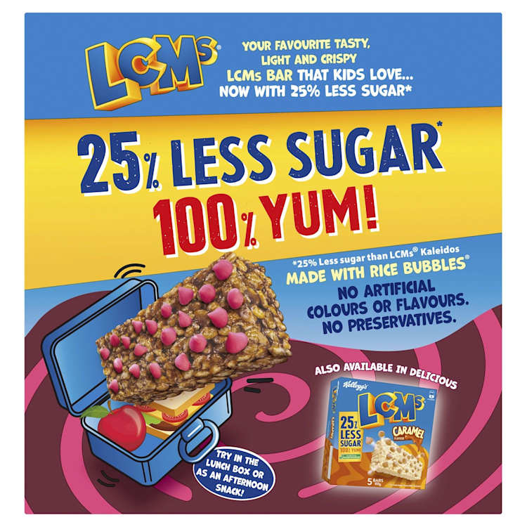 Kellogg's LCMs 25% Less Sugar snack bars are a delicious snack made with Rice Bubbles and cocoa and topped with Strawberry flavoured choc chips. It's the LCMs bar that kids love, now with 25% Less Sugar!