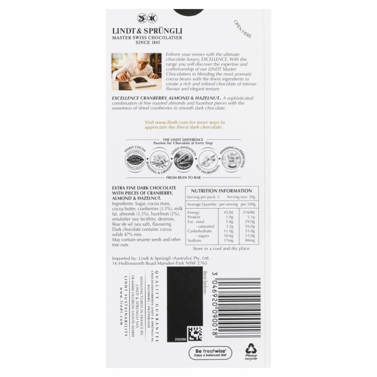 Lindt Excellence Cranberry, Almond & Hazelnut Dark Chocolate100 Gram