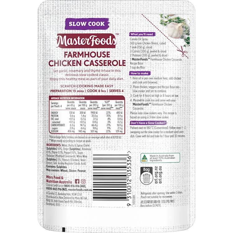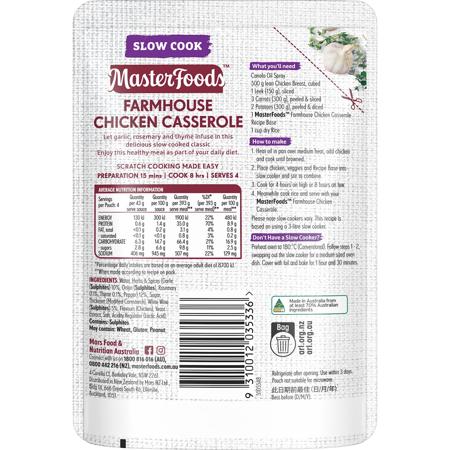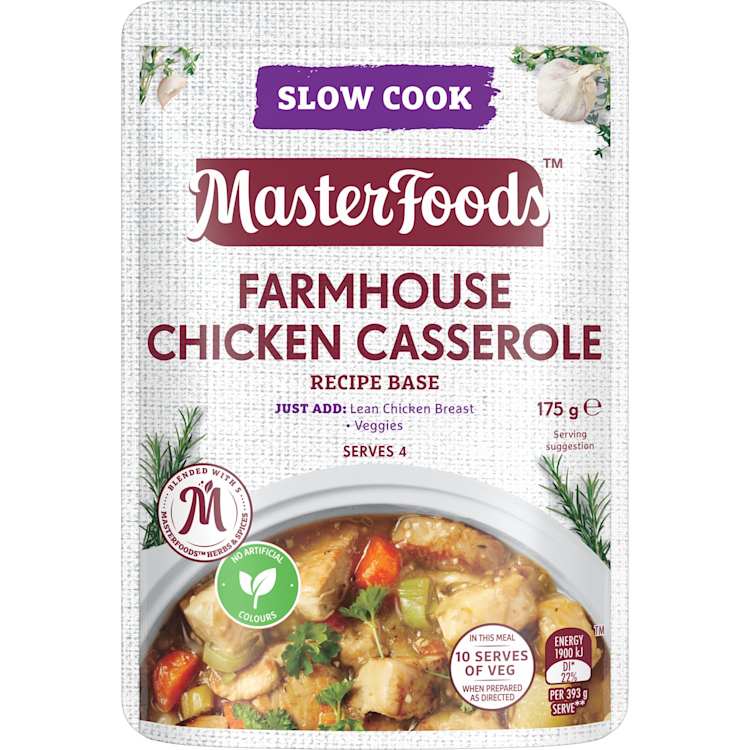 Create a wholesome, hands-off slow cooked dinner with MasterFoods Farmhouse Chicken Casserole Slow Cook Recipe Base. A classic blend with garlic, rosemary, thyme and a splash of white wine.