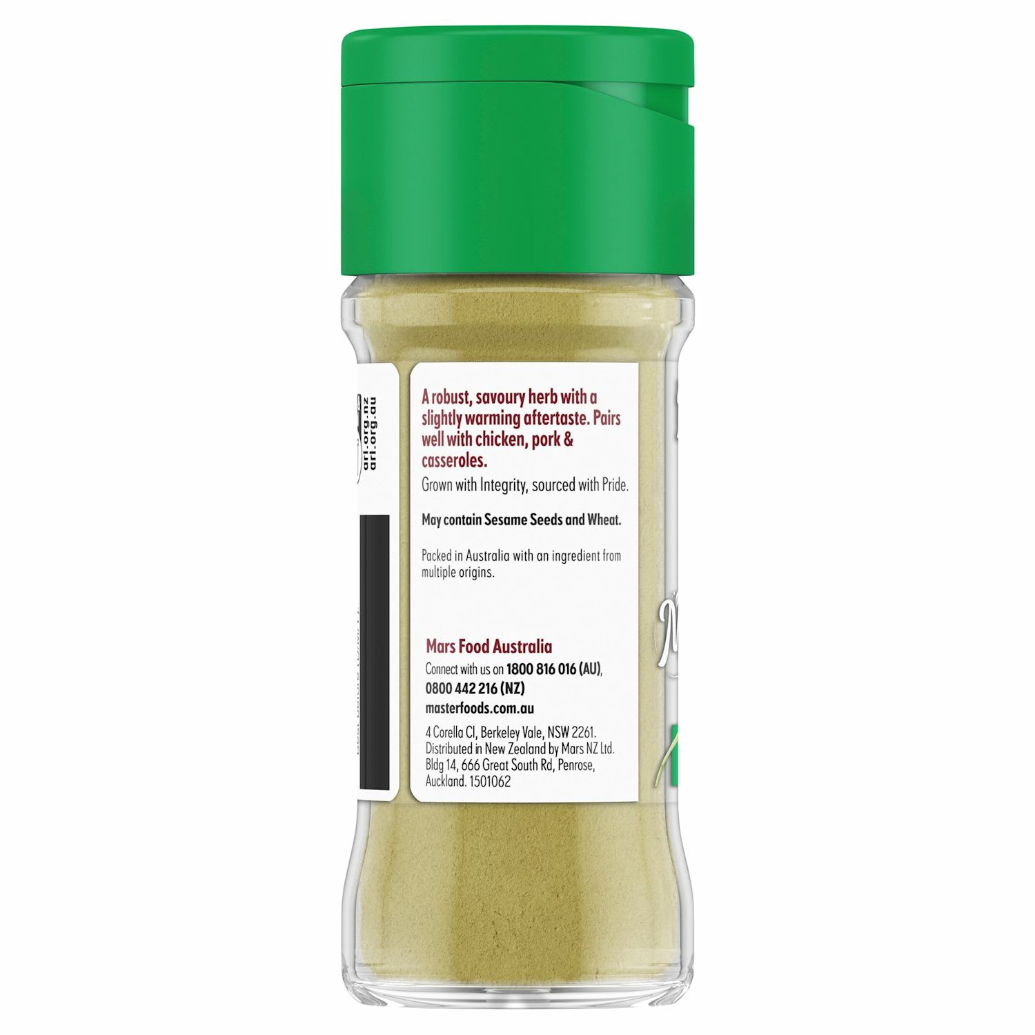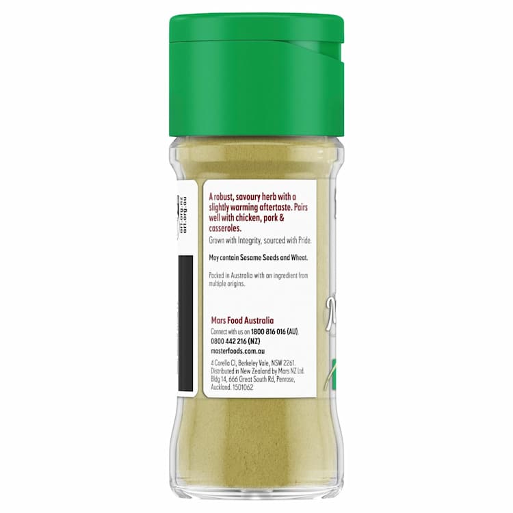 A robust, savoury herb with a slightly warming aftertaste. Pairs well with chicken, pork and casseroles.MasterFoods jars now have a flip top lid, labelled with the flavour name making them easy to find and use at home.