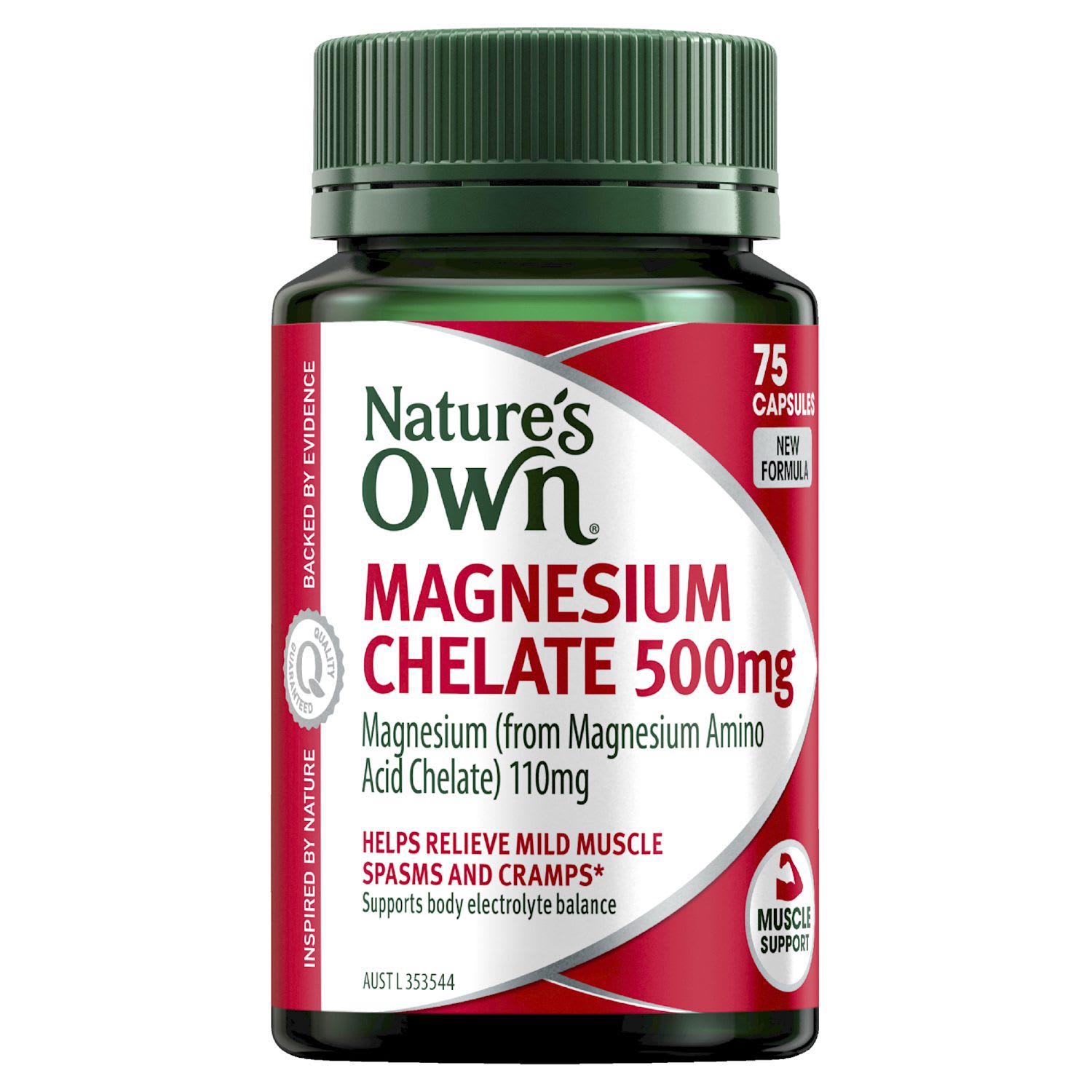 Help relieve mild muscle spasms and muscle cramps with Nature’s Own Magnesium Chelate 500mg capsules. Each capsule provides 110mg of Magnesium (from Magnesium Amino Acid Chelate), which helps the body maintain electrolyte balance, supports muscle function and relaxation, and also relieves muscle tiredness, helps relieve mild muscle spasms and muscle cramps when dietary intake is inadequate. In addition, Magnesium supports bone health, maintains bone density, and assists metabolism of calcium. Australian Made® and rigorously tested to ensure quality, potency, and purity, Nature’s Own Magnesium Chelate 500mg tablets contain no added gluten, lactose, artificial colours, artificial flavours, artificial sweeteners, or dairy products. Adults: Take 2 capsules twice daily with food or as recommended by your healthcare professional. If symptoms persist consult your healthcare practitioner. Mineral supplements should not replace a balanced diet. Always read the label and follow the directions for use.