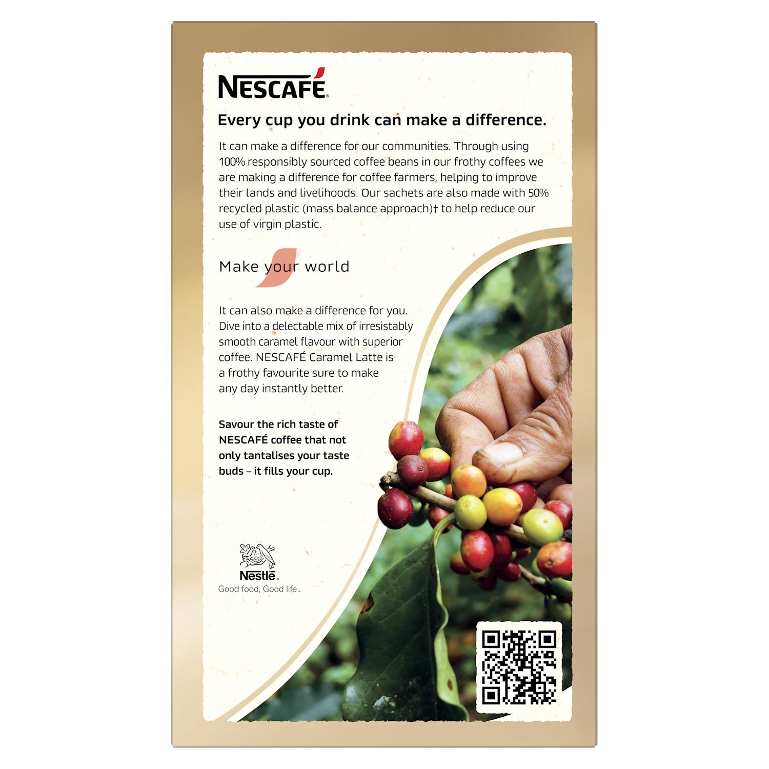 Make your daily coffee routine a little more enjoyable with NESCAFE Caramel Latte. With a delectable layer of velvety froth and quality coffee infused with irresistibly smooth caramel flavour, enjoy a cafe style creamy caramel latte and treat yourself at any time in the comfort of your own home. All you need to do is add hot water and give it a good stir. The result is a delightfully creamy coffee that you can enjoy from the first to the last sip. So whatever you’re up to, Now's good for a deliciously creamy NESCAFE Caramel Latte. NESCAFE. Make Your World.