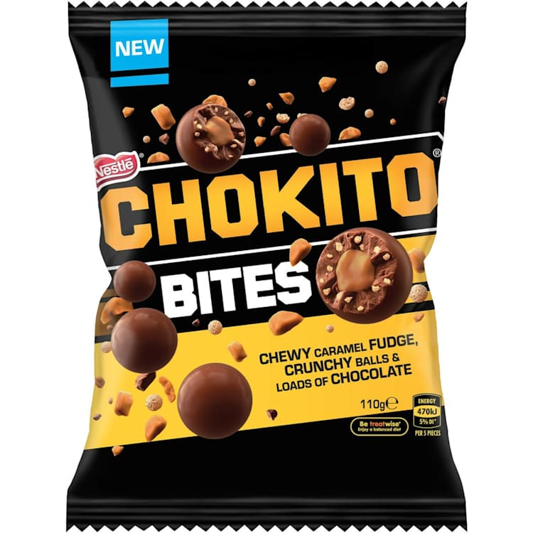 Say YES to the good stuff. Enjoy the big taste of Chokitos now bitesized! Bite into a chewy caramel fudge centre, crunchy, crispy balls and loads of delicious milk chocolate. • Made with 100% certified sustainable cocoa, supplied through the Nestle Cocoa Plan• Recycle me! Return your wrappers in store through REDcycle. • Proudly made in our Australian factory, in Campbellfield, Victoria. • Suitable for vegetarians.