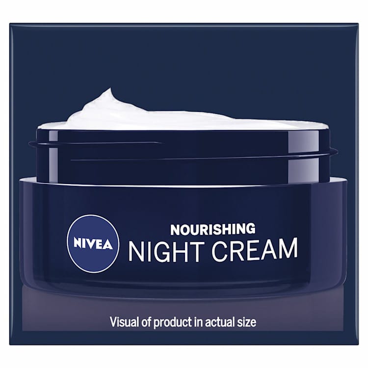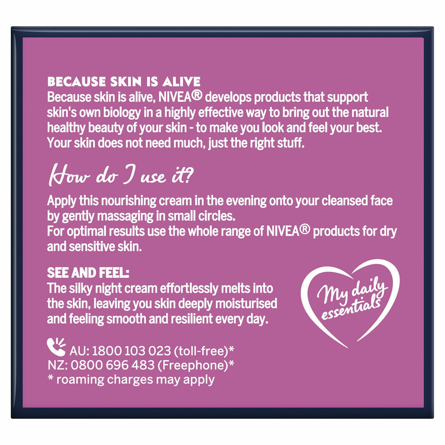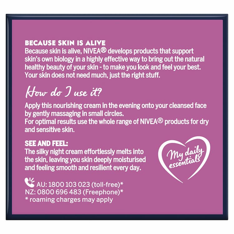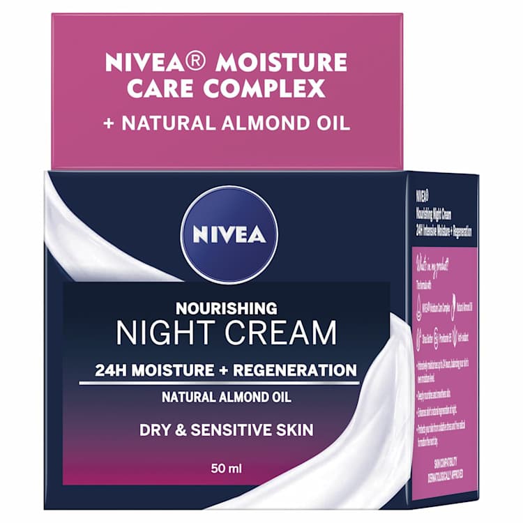 NIVEA Nourishing Night Cream for Dry Sensitive Skin with Natural Almond Oil and Provitamin B5 enhances skin's natural regeneration process at night, when your skin is the most receptive, so you can wake up to beautiful results. The light-weight formula boosts your skin with fast-absorbing moisture while helping protect your skin from oxidative stress and free radical formation the next day. Simply apply this cream to your cleansed face by gently massaging in, avoid direct eye contact. Suitable for dry and sensitive skin types, experience intensively nourished skin for 24 hours.