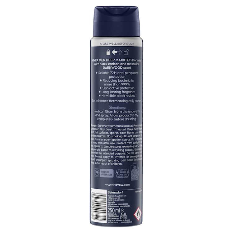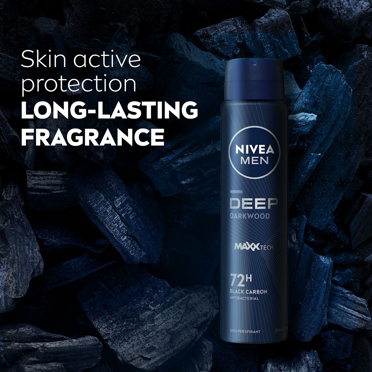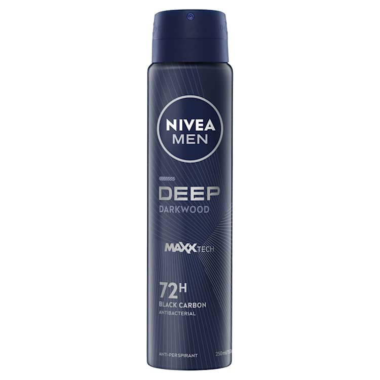 NIVEA MEN DEEP Darkwood Anti-Perspirant Aerosol protects your skin from sweat and bacteria for a long-lasting dryness and a clean skin feel, as if you’ve just stepped out of the shower. The effective anti-bacterial formula with black carbon and MAXXTECH, works without leaving any visible black residue and is complemented by a modern and masculine Darkwood fragrance. Reliable 72 hour protection72 hour protection for a long-lasting dry and clean skin feeling, just like after a shower. Get the reliable protection and care that you deserve! The skin tolerance of this anti-perspirant has been dermatologically proven