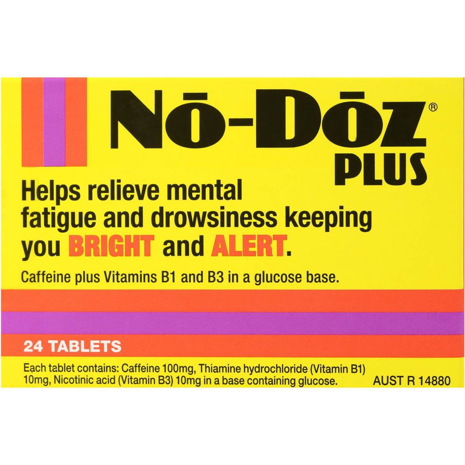 Each No-Doz Plus tablet contains 100mg of caffeine, plus 10mg of Vitamin B1 and 10mg of Vitamin B3 in a glucose base.