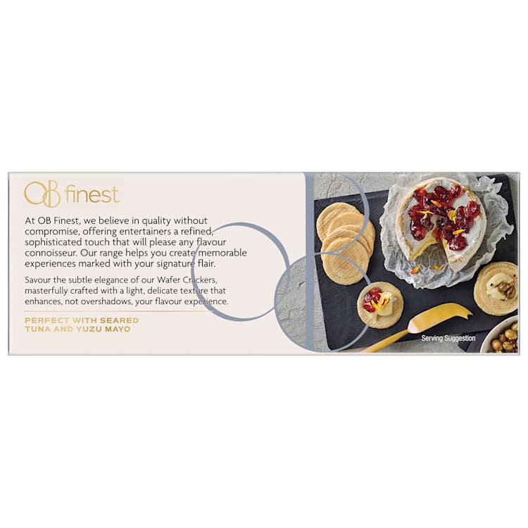 At OB Finest, we believe in quality without compromise, offering entertainers a refined, sophisticated touch that will please any connoisseur. Our range helps you create memorable experiences marked with your signature flair. Savour the subtle elegance of our Wafer Crackers, masterfully crafted with a light, delicate texture that enhances, not overshadows, your flavour experience.