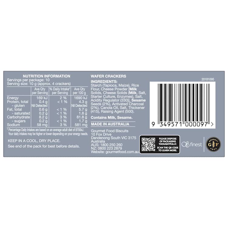 Light and crispy OB Finest Activated Charcoal Gluten Free Wafer Crackers are the perfect accompaniment to your cheese or charcuterie platter for any entertaining or social occasion.