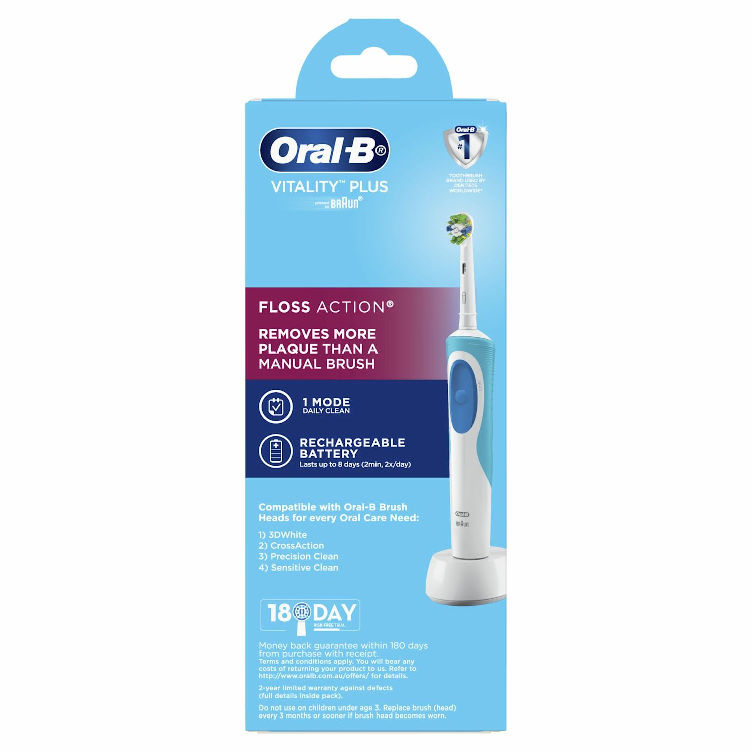 Oral-B Vitality Plus FlossAction cleans deep between teeth to remove up to 100% more plaque leaving your whole mouth cleaner than a regular manual toothbrush. Features Oral-B NEW Bristle Technology: Green bristles turns yellow signalling when to change. It's dentist inspired round head surrounds each tooth for a superior clean.# Oral-B # Electric toothbrush # Clean