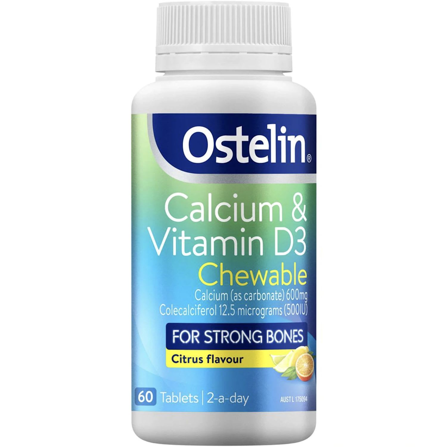 Support your bone strength, muscle function, and healthy immune system function with Ostelin Calcium & Vitamin D3 Chewable Tablets 60. Ostelin Calcium & Vitamin D3 Chewable Tablets are a supplement designed to support bone strength and bone density–and the citrus-flavoured chewable tablets are a convenient alternative to swallowing tablets. Each tablet contains a combination of Vitamin D3 and Calcium Carbonate, and works to support bone strength. Vitamin D3 increases the body's absorption of calcium. Calcium is a building block of bones, and each tablet provides 600 mg of elemental calcium. Ostelin Calcium & Vitamin D3 Chewable Tablets provide a convenient way to support bone density and bone strength. Adults and teens 13-18 years, chew 2 tablets daily with a meal, or as directed by your healthcare professional.