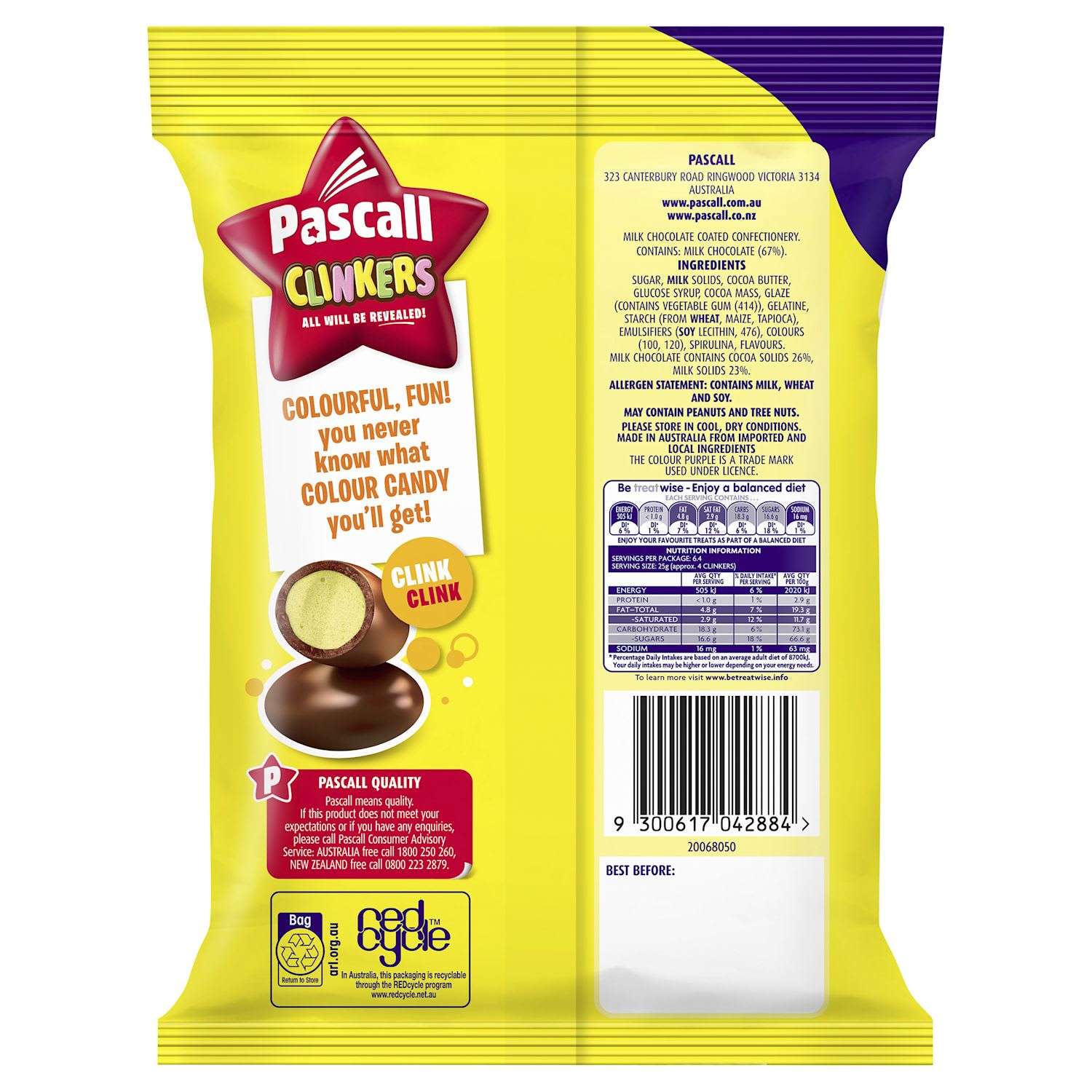 Colourful, fun! You never know which colour candy you'll get! PASCALL Cadbury Clinkers are colourful candy centres dipped in smooth and delicious Cadbury Milk chocolate.