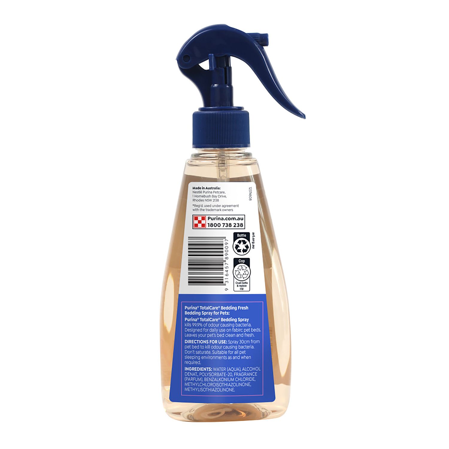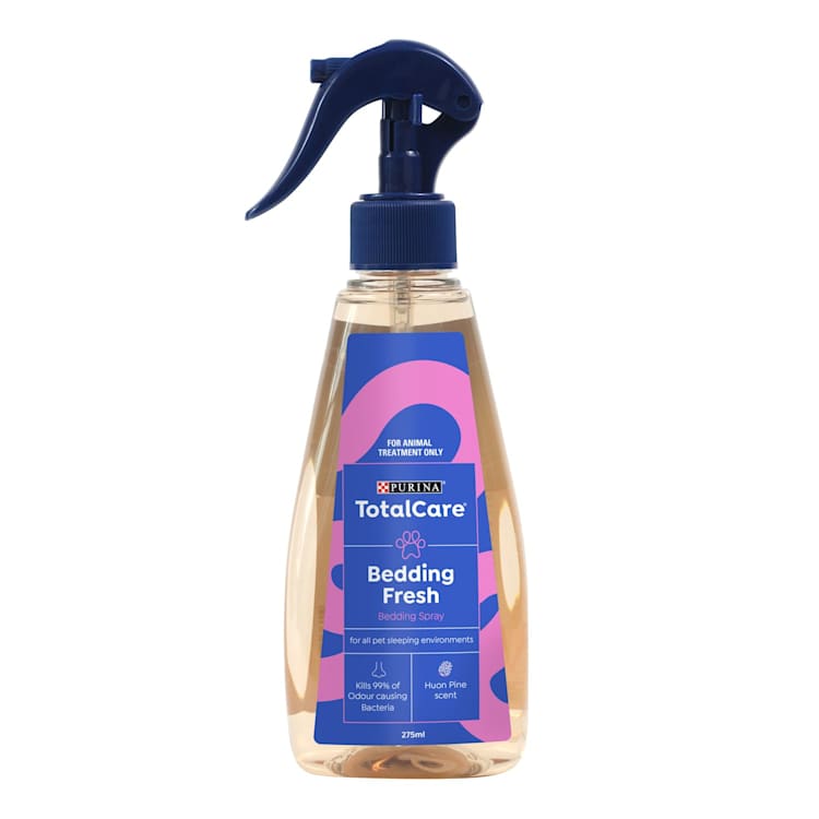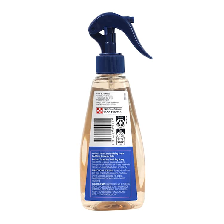 PURINA TOTAL CARE Bedding Fresh Spray kills 99.9% of odour causing bacteria. Designed for daily use on fabric pet beds. Leaves your pet's bed clean and fresh.