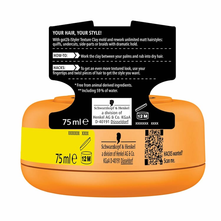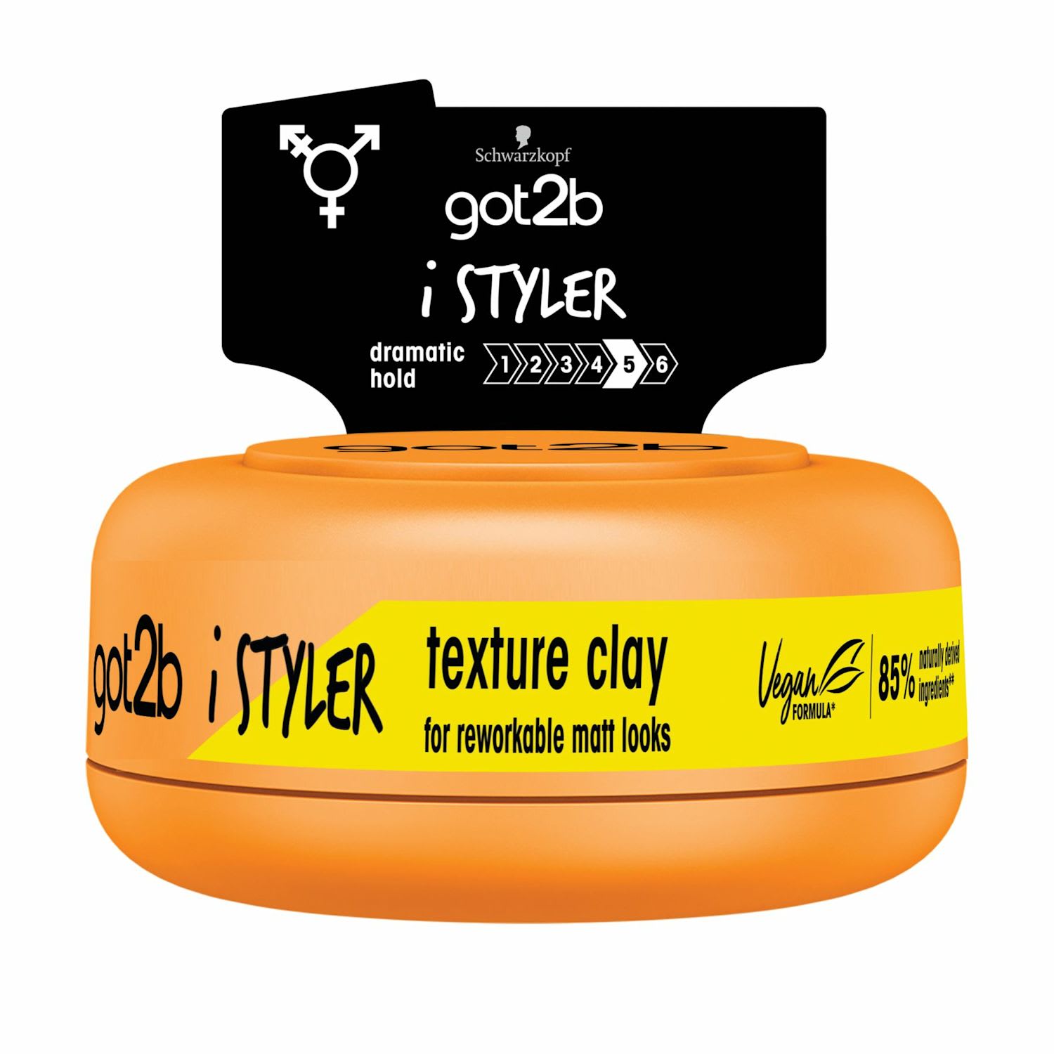 It’s got to be got2b!Want a remouldable style & hair with plenty of texture? Try got2b iStyler Texture Clay which shapes your hair & gives your style a matt finish & lasting hold.Work the clay between your palms & rub into dry hair. For added definition rub a small amount of clay between your fingertips & twist sections of hair.From volume & shine to hold & spikes, got2b offers the right styling products for your individual look. It’s all about expressing your style - show off your personality, individuality & attitude with got2b brand! No matter what look you're going for, you can get it with got2b products. You got2b you!Jar & Lid can be placed in kerbside recycling bin. Jar & Lid can also be recycled via TerraCycle. Visit TerraCycle.com for details.