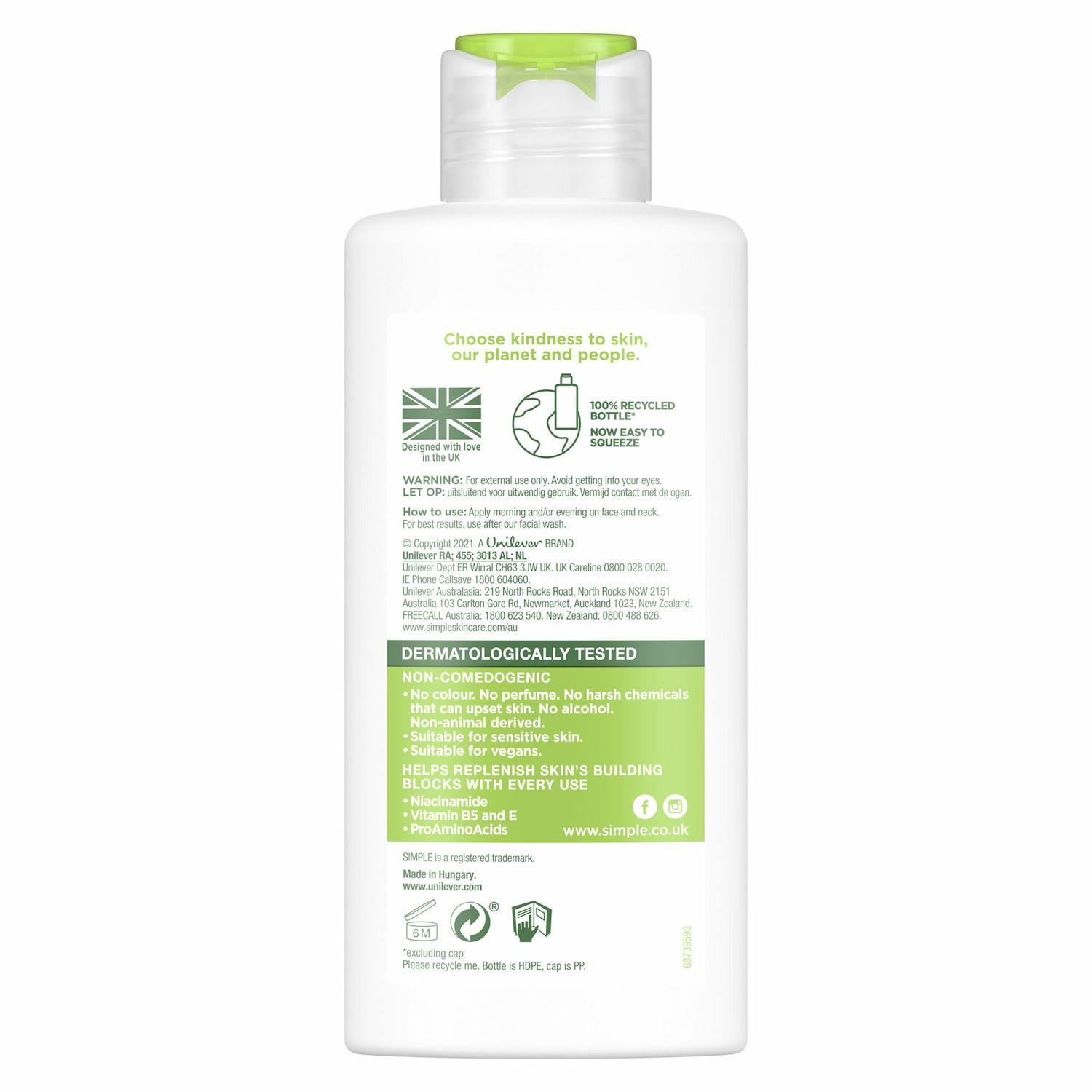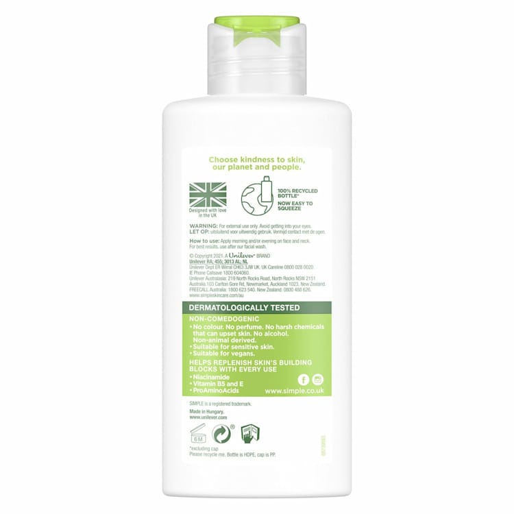An ultra-nourishing boost of hydration for long-lasting skin replenishment. Meet Simple Kind to Skin Replenishing Rich Moisturiser. Supercharged with a vitamin-rich formula – this is the same gentle care you know and love from Simple – made even more effective for 12-hour moisturisation, plus strong, healthy-looking and smooth skin. With niacinamide, together with pro vitamin B5 and vitamin E, this antioxidant-rich, ultra-hydrating moisturiser helps even skin tone and texture. Plus, every rich, creamy application helps replenish dry skin to become more resilient against damage. Pro Amino Acid Technology boosts the levels of strengthening amino acids naturally present in skin, for a hydrated and strong skin barrier against drying elements like pollution, harsh weather and dry air. You’ll love the comforting, rich texture which leaves skin soft, smooth and cared-for with lasting hydration. Packed with ultra-nourishing ingredients and skin-smoothing actives, this daily moisturiser is suitable for all skin types and is super gentle – even on the most dry and sensitive skin. Like all Simple skin care products, our Replenishing Rich Moisturiser is dermatologically tested, hypoallergenic, contains no harsh chemicals that can upset your skin and is free from alcohol, mineral oils, artificial colours and perfume. What’s more, this Simple moisturiser is PETA approved and vegan, with an easy-to-squeeze, planet-friendly bottle that’s made with 100% recycled plastic.
