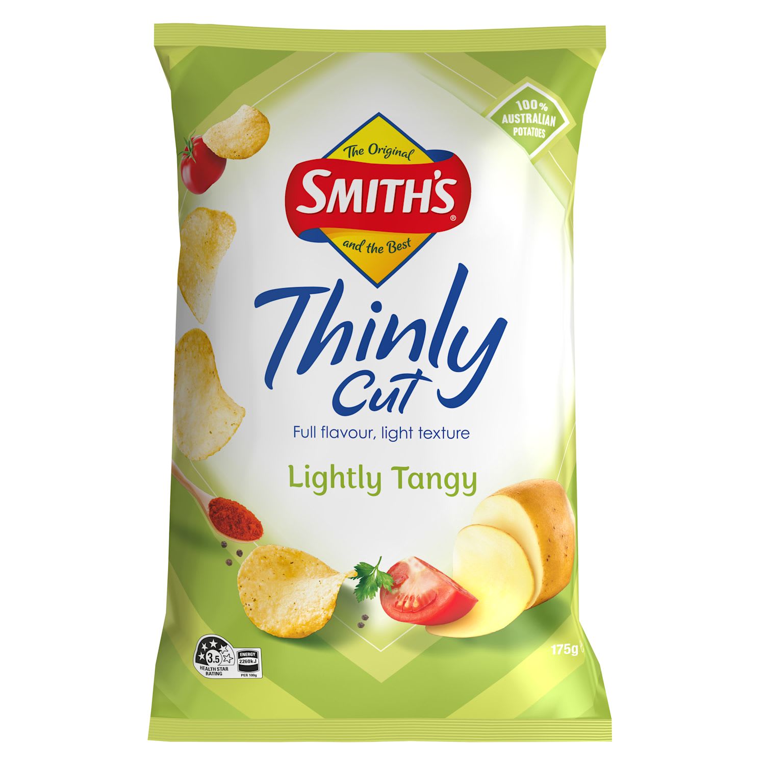 Convenient and gluten-free, Smith's Thinly Cut Lightly Tangy Potato Chips is the delicious choice for everyone's lunchbox snack. After all, who doesn't love the taste and crunch of these potato chips? Add some fun into everyone's lunchbox with a portion of the classic crunch of Smith's Thinly Cut Chips.
