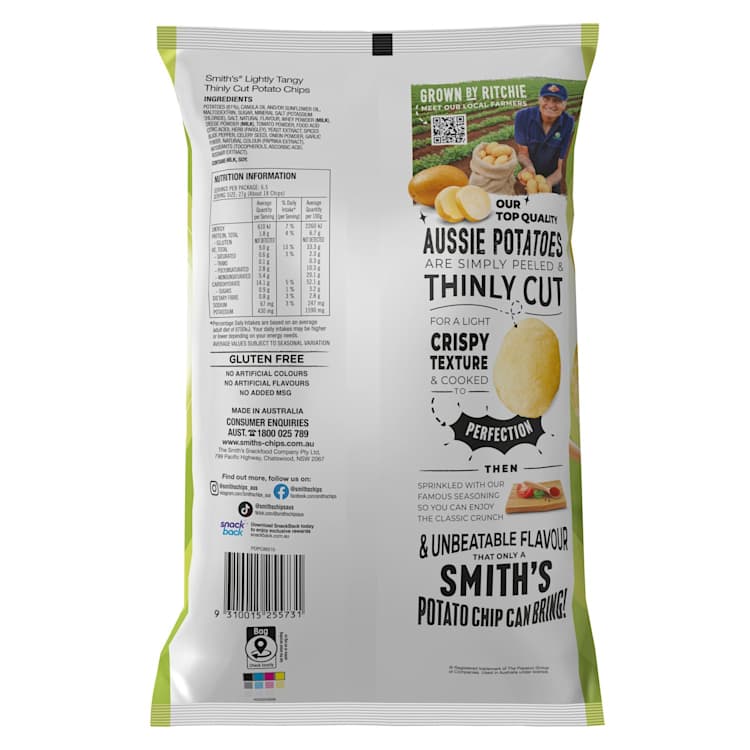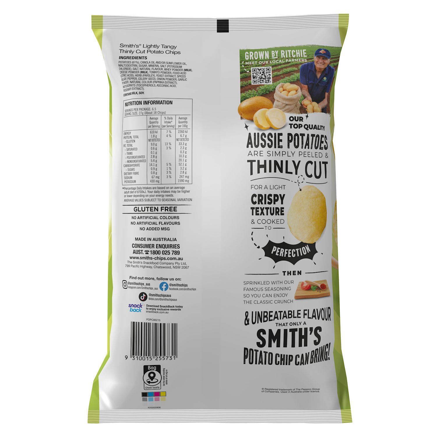 Smith’s Thinly Cut Lightly Tangy Potato Chips Share Pack is your party staple for that light but satisfying crunch. Keep the good vibes rolling with the share pack size, so no one will be left out of the flavour fest! Sliced thinly to suit the familiar Smith's taste Australia has grown to know and love, there's no chance of passing on this delightfully crispy ride. So long as you're stocked up on Smith's potato chips, the good vibes will keep on coming your way!