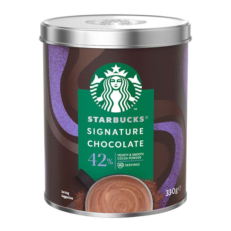 Melt into a luscious cup of STARBUCKS Signature Chocolate 42% Cocoa Powder to round off your evening. Inspired by the STARBUCKS Hot Chocolate you love, we've crafted this velvety and smooth chocolate powder for you to prepare at home. Our selected cocoa powder delivers a velvety and smooth chocolate taste. Simply stir with warm milk for the ultimate hot chocolate experience. Enjoy your STARBUCKS favourites at home. Preparation:1. Add 200ml of warm semi skimmed milk per cup.2. Add 5 tsp of STARBUCKS Signature Chocolate 42% Cocoa Powder.3. Stir well, sit back and enjoy your homemade hot chocolate.• STARBUCKS Signature Chocolate 42% Cocoa Powder with velvety and smooth notes• Inspired by the STARBUCKS Hot Chocolate you enjoy in STARBUCKS coffee shops• Crafted with high quality 42% cocoa powder• 15 servings per tin• Enjoy your STARBUCKS favourites at home• Committed to 100% sustainably sourced cocoa, certified by the Rainforest AllianceSTARBUCKS and the Starbucks logo are used under license by NESTLE.